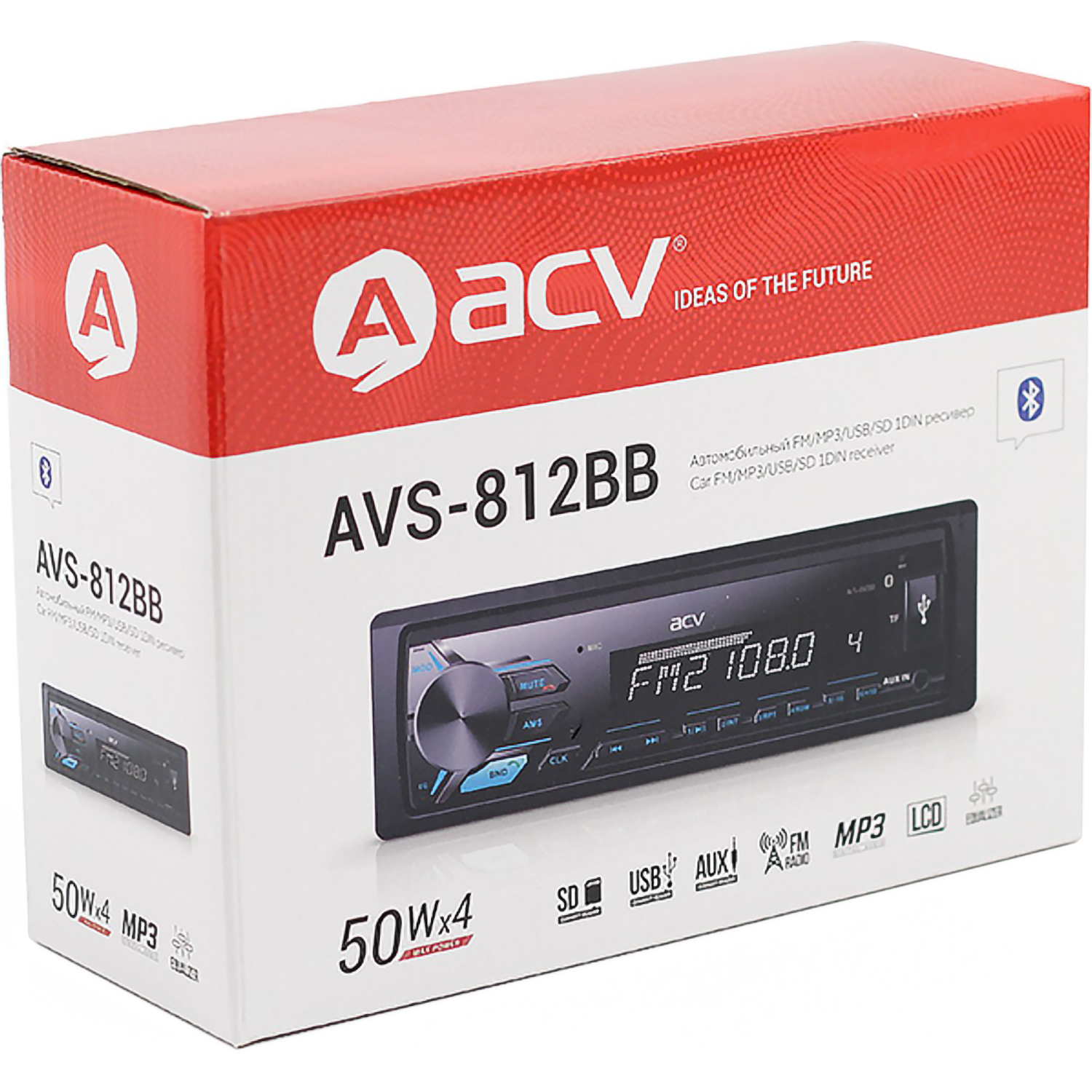 Прибор ACV AVS-812BB дополнен эквалайзером, FM-тюнером и модулем Bluetooth для воспроизведения музыки и совершения звонков. Устройство поставляется с набором проводов для подключения. Данная модель совместима со смартфонами, работающими на основе Android, iOS или iPod.
