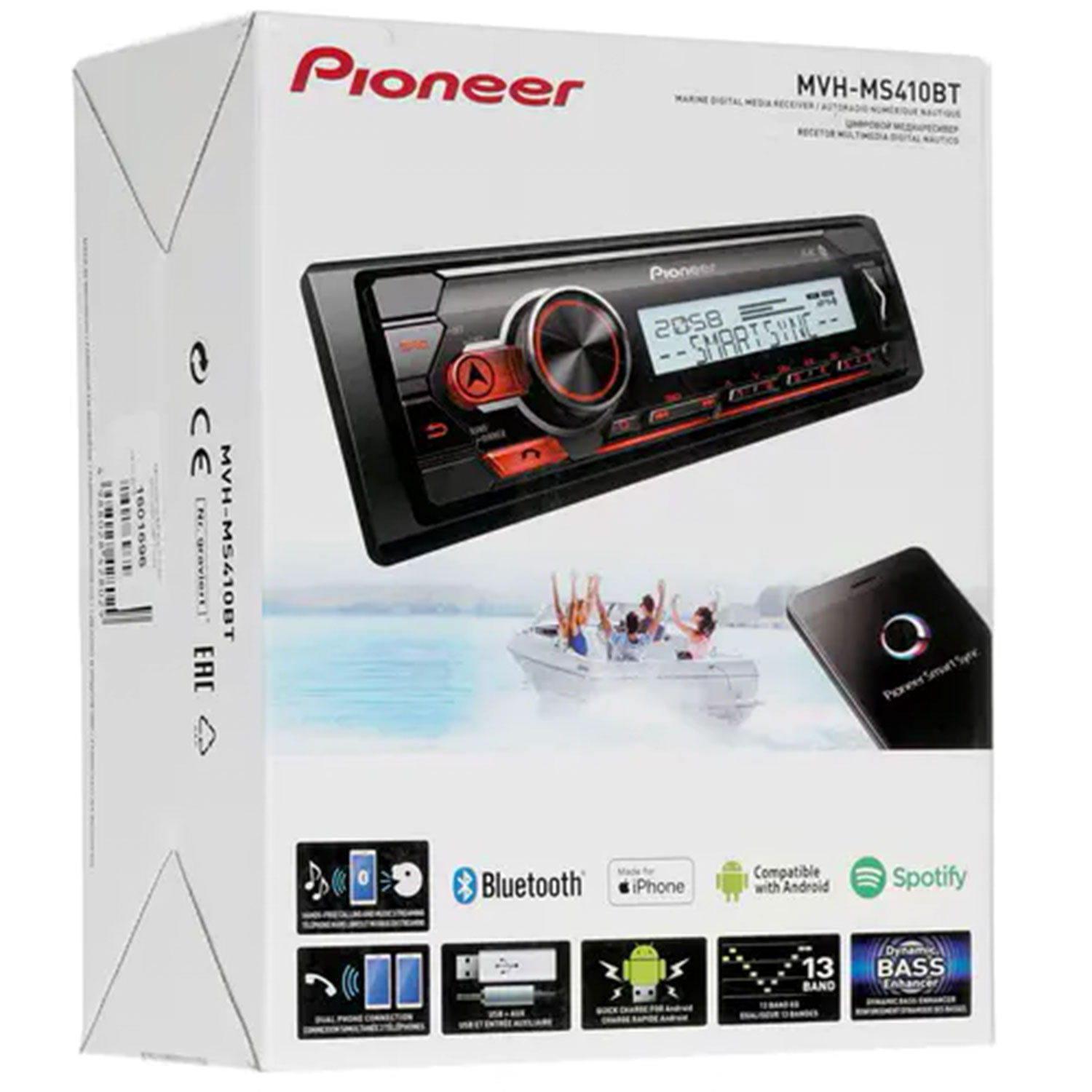 Ресивер Pioneer MVH-MS410BT защищен от воздействия влаги, выцветания и образования пятен, поддерживает технологии Bluetooth, USB, Spotify и совместим с приложением Pioneer Smart Sync.
